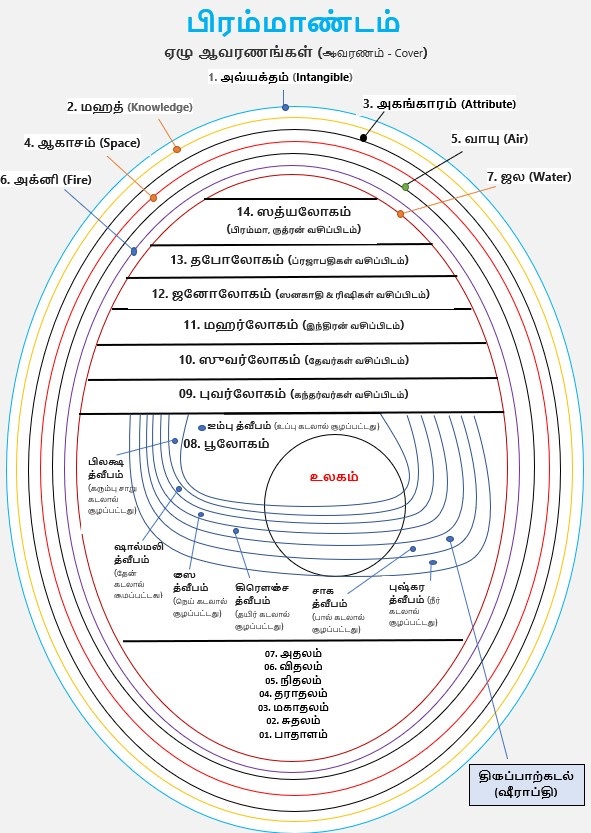 ஒவ்வொரு லோகத்தின்/ துவீபத்தின்/ ஆவரணத்தின் அளவோ , தூரமோ & உயரமோ மேலே குறிப்பிடவில்லை. அதே போல் மேரு மலை மற்றும் இதர கூறுகளையும் தவிர்த்துள்ளேன் வாசகர்கள் எளிதாக புரிந்து கொள்வதற்காக. அதனை இன்னொரு பதிவில் விளக்க முயல்கிறேன்.